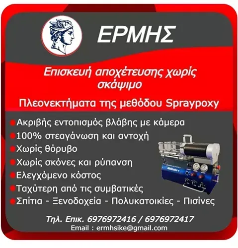 Η εταιρεία Ερμής, με έδρα τον Βόλο, εξειδικεύεται στην επισκευή σωληνώσεων και αποχετεύσεων με τη χρήση της προηγμένης τεχνολογίας SPRAYPOXY, χωρίς σκάψιμο ή αντικατάσταση. Επαναφέρουμε σωλήνες από μαντέμι, πηλό, μόλυβδο ή άλλες παραμορφωμένες σωληνώσεις στην αρχική τους μορφή, προσφέροντας μακροχρόνιες και ανθεκτικές λύσεις.